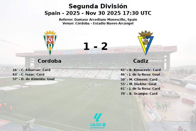 O Cádiz, demonstrando grande efetividade, aproveitou suas limitadas oportunidades. J. de la Rosa abriu o placar aos 46 minutos, após assistência de S. Ortuno. M. Diakite ampliou a vantagem aos 55 minutos com outro gol, assistido por I. Carcelen. O Córdoba respondeu rapidamente com um gol de D. de Almeida aos 57 minutos, com assistência de C. Isaac, dando esperanças aos anfitriões.