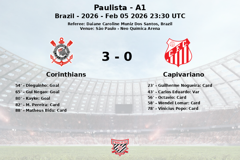 São Paulo, 5 de fevereiro de 2026 – O Corinthians venceu o Capivariano de forma convincente em partida realizada na Neo Química Arena, correspondente à sexta rodada da temporada regular do Paulista – A1. A equipe da casa controlou a partida desde o início, mantendo 61% de posse de bola e criando mais oportunidades de gol.