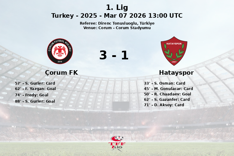 Corum, Turquia – Em um jogo disputado no Corum Stadyumu sob o olhar atento do árbitro Direnc Tonusluoglu, o Çorum FK protagonizou uma virada espetacular contra o Hatayspor na 29ª rodada da 1. Lig. O jogo, realizado em 7 de março de 2026, foi marcado pela intensidade e um grande número de advertências.