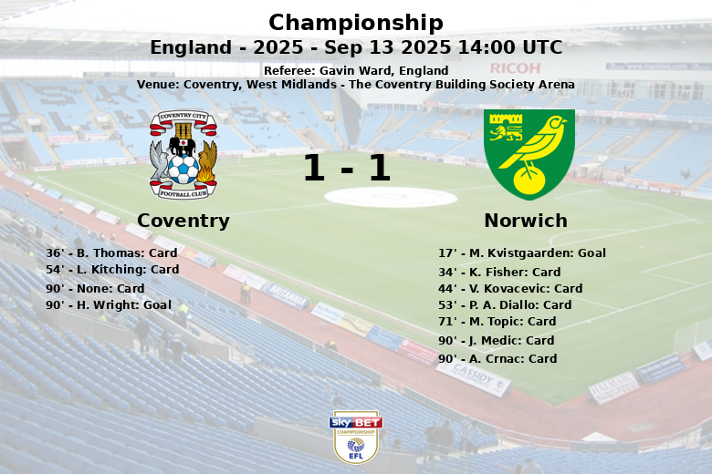 Coventry, West Midlands – Em uma partida disputada no The Coventry Building Society Arena, Coventry e Norwich City empataram em um jogo que teve mais interrupções do que brilhantismo futebolístico. O Norwich abriu o placar aos 17 minutos com um gol de M. Kvistgaarden, assistido por J. Medic. A partir daí, o jogo foi caracterizado por um jogo truncado e um acúmulo de cartões amarelos. O Coventry recebeu duas advertências (B. Thomas e L. Kitching), enquanto o Norwich viu seis cartões amarelos (K. Fisher, V. Kovacevic, P. A. Diallo, M. Topic, J. Medic e A. Crnac). O Coventry dominou a posse de bola com 64% e acumulou 28 chutes, mas apenas 4 foram no alvo. Finalmente, aos 90 minutos, H. Wright empatou para o Coventry, frustrando as aspirações do Norwich de levar os três pontos. A partida terminou com uma divisão de pontos que refletiu a intensidade e a falta de precisão de ambos os lados.