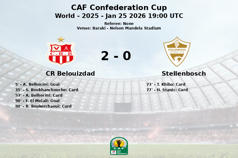 A partida, correspondente à rodada 3 da Taça da Confederação da CAF, deixa o CR Belouizdad em uma posição favorável dentro do torneio. A partida terminou CR Belouizdad 2 – Stellenbosch 0.