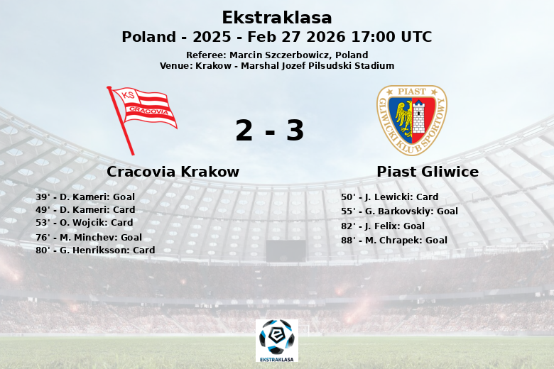 O Cracovia retomou a liderança aos 76 minutos com um gol de M. Minchev, assistido por A. Al Ammari. Quando parecia que a equipe da casa conquistaria a vitória, o Piast Gliwice mostrou sua resiliência. J. Felix empatou aos 82 minutos, e M. Chrapek selou a vitória do Piast Gliwice aos 88 minutos, assistido por O. Lesniak.