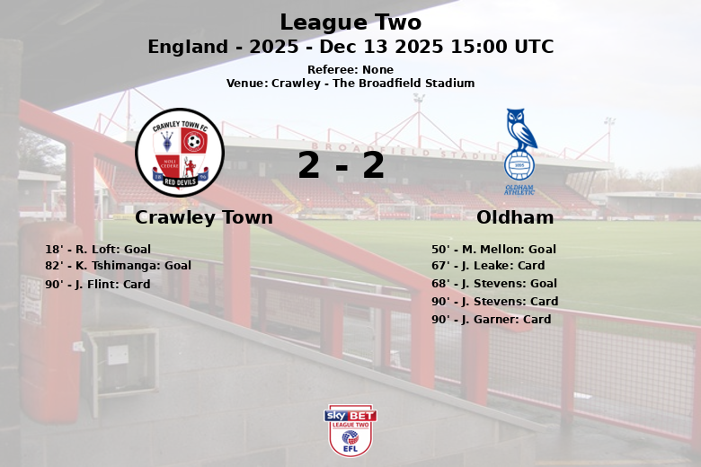 Crawley Town dominou a posse de bola com 56%, gerando 18 chutes, dos quais 5 foram no alvo. R. Loft abriu o placar para os donos da casa aos 18 minutos, mas Oldham respondeu no segundo tempo com um gol de M. Mellon aos 50 minutos. J. Stevens colocou Oldham à frente aos 68 minutos, no entanto, K. Tshimanga empatou para Crawley aos 82 minutos.