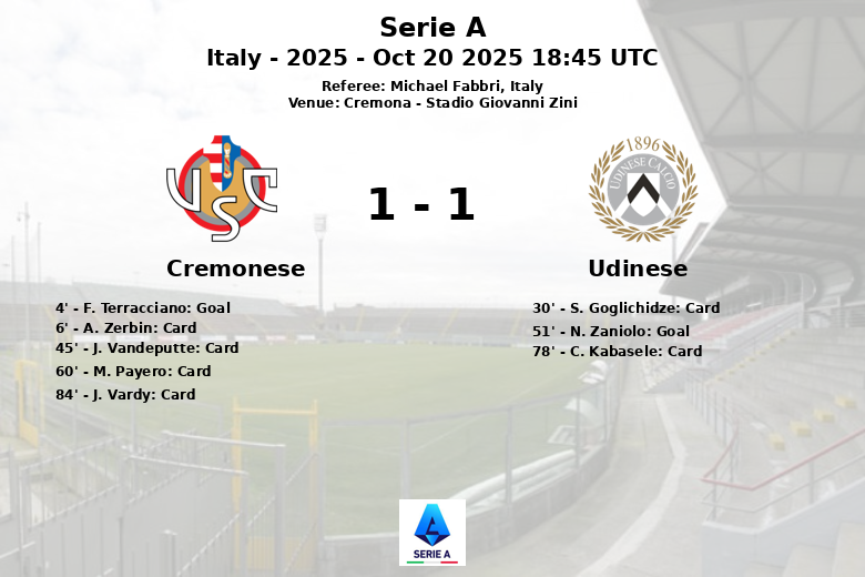 Cremonese e Udinese empataram em um jogo marcado pela intensidade e cartões amarelos no Stadio Giovanni Zini. O Cremonese abriu o placar logo aos 4 minutos com um gol de F. Terracciano, assistido por J. Vandeputte. No entanto, a alegria da equipe da casa foi atenuada por uma série de cartões amarelos mostrados a Zerbin, Vandeputte, Payero e Vardy ao longo da partida. A Udinese respondeu no segundo tempo, empatando aos 51 minutos com um gol de N. Zaniolo, assistido por A. Zanoli. Apesar dos esforços de ambas as equipes, o placar permaneceu inalterado, deixando um gosto agridoce para os torcedores. O Cremonese dominou a posse de bola com 52%, mas a eficiência ofensiva da Udinese resultou em um valioso ponto fora de casa. O árbitro Michael Fabbri teve uma noite agitada, mostrando um total de seis cartões amarelos.