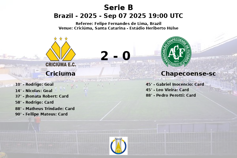 A partida terminou com o Criciuma marcando dois gols e a Chapecoense-sc marcando Zero gols.
