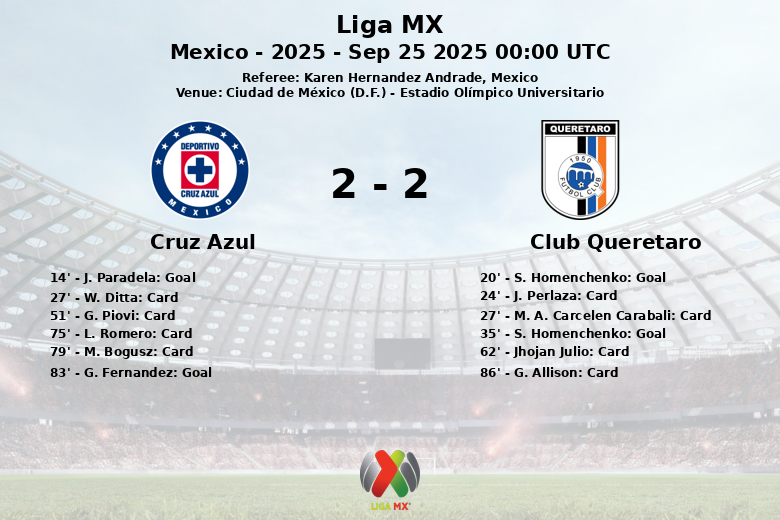 Apesar da superioridade numérica, o Cruz Azul não conseguiu concretizar suas oportunidades, com apenas 7 chutes a gol de 22 tentativas. A expulsão de Romero aos 75 minutos complicou ainda mais a situação para o time da casa. No entanto, um gol de Fernandez aos 83 minutos, sem assistência, empatou o placar e selou um empate sofrido para o Cruz Azul. A partida terminou com o Queretaro defendendo com unhas e dentes, e o Cruz Azul frustrado por não conseguir capitalizar seu domínio territorial.