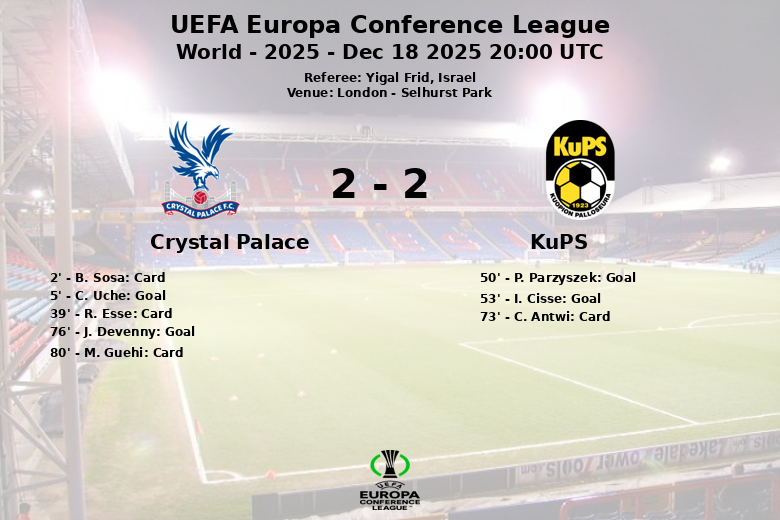 Londres, 18 de dezembro de 2025 – Em uma partida vibrante e disputada no Selhurst Park, Crystal Palace e KuPS empataram em um confronto válido pela fase de grupos da UEFA Europa Conference League. A partida, arbitrada por Yigal Frid, foi uma montanha-russa de emoções, com oportunidades para ambos os lados.