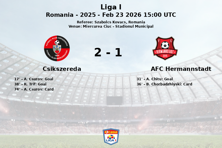 O Csikszereda abriu o placar aos 17 minutos com um gol de A. Csuros, assistido por L. Paszka, levando a alegria à torcida local. No entanto, o AFC Hermannstadt reagiu e A. Chitu igualou o marcador aos 31 minutos. A resposta do Csikszereda não demorou, e R. Trif colocou sua equipe novamente na frente aos 38 minutos.