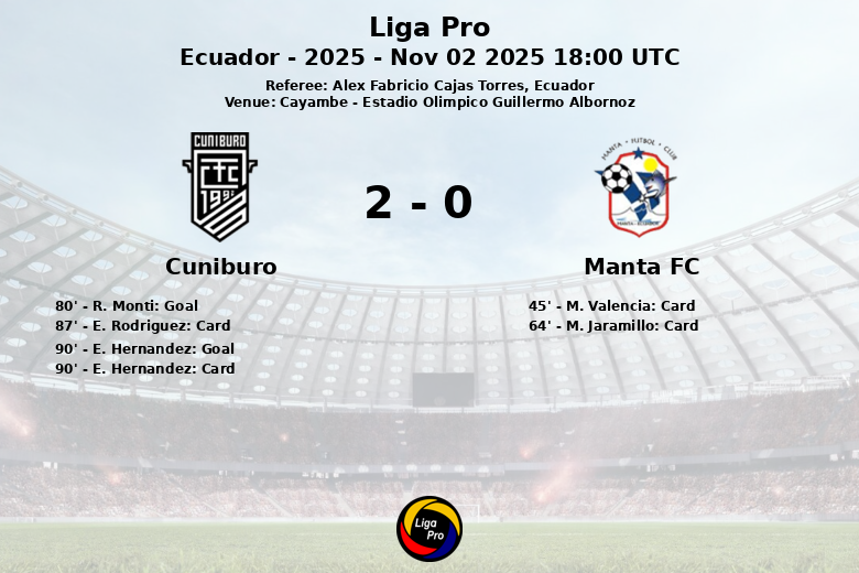 O Cuniburo finalmente capitalizou seu domínio aos 80 minutos com um gol de R. Monti, gerando euforia nas arquibancadas. Nos acréscimos, E. Hernandez selou a vitória com outro gol, pouco antes de receber um cartão amarelo. A partida, correspondente ao Relegation Group – 3 da Liga Pro equatoriana, culminou em uma clara vitória para a equipe da casa, refletida em seus 19 chutes totais contra os meros 4 do Manta FC. O Manta FC terminou a partida com dois jogadores a menos devido à expulsão de M. Jaramillo, além do acúmulo de cartões.