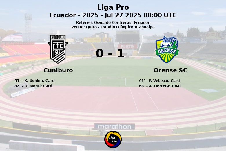 Quito, Equador – Apesar de uma posse de bola dominante de 67% por parte do Cuniburo, o Orense SC conseguiu garantir uma vitória no Estádio Olímpico Atahualpa. Apesar de controlar a bola e ter um número maior de remates (17 contra 4), o Cuniburo não conseguiu capitalizar as suas chances, conseguindo apenas 8 remates à baliza. O único golo da partida surgiu aos 68 minutos, marcado por A. Herrera, com assistência de M. Bermudez, garantindo os três pontos para a equipa visitante. A partida, arbitrada por Oswaldo Contreras, foi caracterizada por um jogo físico, com um total de 20 faltas e 3 cartões amarelos mostrados (dois para o Cuniburo e um para o Orense SC).