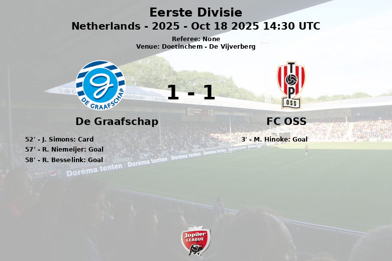 Doetinchem, Países Baixos – Em uma partida disputada no De Vijverberg, o De Graafschap venceu o FC OSS em um confronto onde a posse de bola e a pressão constante foram cruciais para a vitória. O FC OSS surpreendeu no início com um gol madrugador de M. Hinoke aos 3 minutos, assistido por J. Zimmerman, mas o De Graafschap não se intimidou.