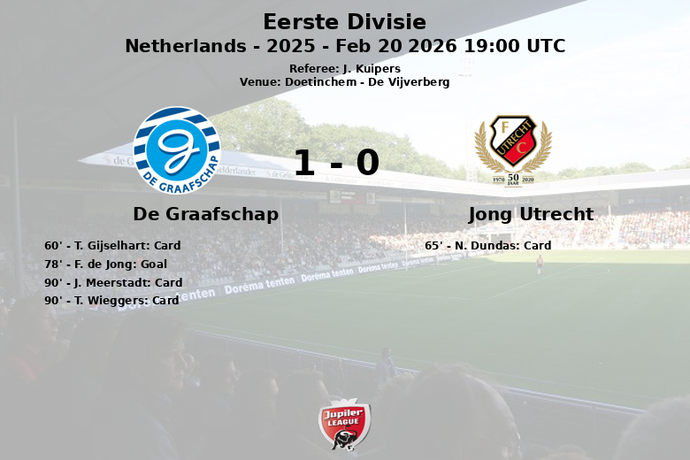 O único gol da partida surgiu aos 78 minutos, graças a F. de Jong, que, sem assistência, conseguiu vencer o goleiro do Jong Utrecht, garantindo a vitória para o De Graafschap.