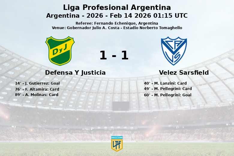 Num jogo disputado no Estádio Norberto Tomaghello em Gobernador Julio A. Costa, Defensa y Justicia e Vélez Sarsfield empataram em 1-1 num jogo correspondente à quinta rodada da Liga Profesional Argentina.