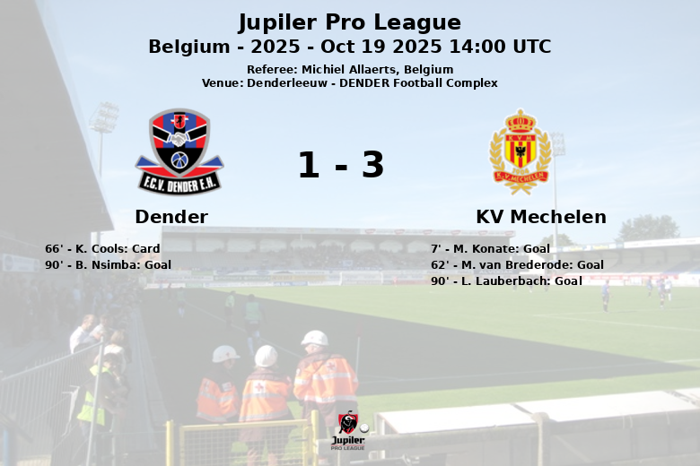 Denderleeuw, Bélgica – Em uma partida disputada no DENDER Football Complex, o KV Mechelen saiu vitorioso contra o Dender em um confronto cheio de ação. A equipe visitante demonstrou eficácia em frente ao gol, aproveitando as oportunidades criadas. M. Konate abriu o placar logo aos 7 minutos, dando ao KV Mechelen uma vantagem inicial. No segundo tempo, M. van Brederode ampliou a vantagem aos 62 minutos. Embora o Dender tenha dominado a posse de bola com 54%, não conseguiu traduzir esse domínio em gols até o final da partida. O KV Mechelen, com 46% de posse, foi mais direto e preciso em seus ataques. Já nos acréscimos, L. Lauberbach selou a vitória para o KV Mechelen aos 90 minutos. No entanto, o Dender não desistiu e B. Nsimba marcou um gol de pênalti no último minuto, melhorando o resultado final. A partida terminou com um total de 15 chutes para o Dender, dos quais apenas 4 foram no alvo, enquanto o KV Mechelen realizou 11 chutes, com 6 direcionados ao gol.