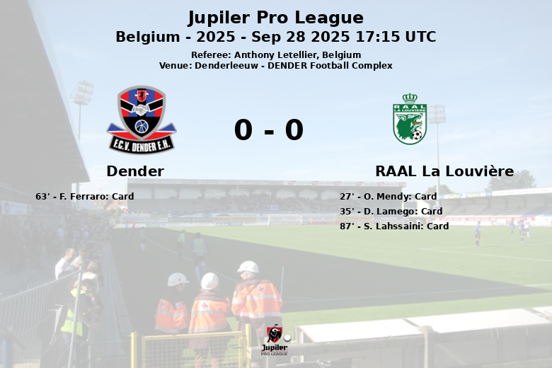 DENDERLEEUW, Bélgica – Em uma partida realizada no DENDER Football Complex, Dender e RAAL La Louvière empataram em um jogo caracterizado por uma forte posse de bola do Dender. A equipe da casa desfrutou de 63% da posse de bola, mas só conseguiu gerar 10 chutes, dos quais apenas 2 foram no alvo. A defesa do La Louvière se mostrou sólida e frustrou as tentativas do Dender.
