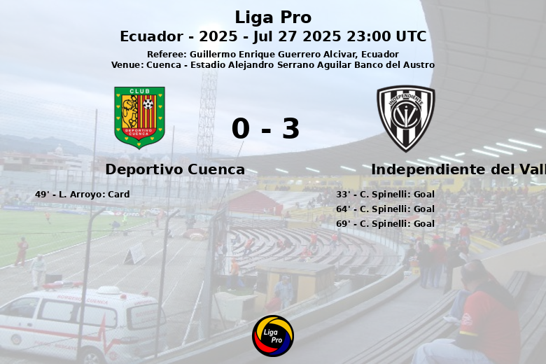 O Deportivo Cuenca teve dificuldades para criar oportunidades de gol, registrando apenas 2 chutes, nenhum deles no alvo. Além disso, sofreu a expulsão de L. Arroyo aos 49 minutos, complicando ainda mais suas chances de uma virada. O Independiente del Valle, por outro lado, mostrou grande eficácia ofensiva, com 19 chutes no total, 12 deles direcionados ao gol adversário. A partida foi arbitrada por Guillermo Enrique Guerrero Alcivar.
