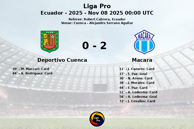 O árbitro Robert Cabrera mostrou um total de dez cartões amarelos, seis para o Macará e quatro para o Deportivo Cuenca, refletindo a intensidade do jogo. O Deportivo Cuenca gerou um maior número de chutes (19 contra 7 do Macará) e escanteios (13 contra 1), mas a eficácia do Macará em frente ao gol foi determinante. A partida, correspondente à quinta rodada do Grupo de Colocação da Liga Pro 2025, deixou um gosto amargo para a equipe da casa, que terá que melhorar sua pontaria em frente ao gol nas próximas partidas. A partida foi concluída com um placar favorável à equipe visitante.