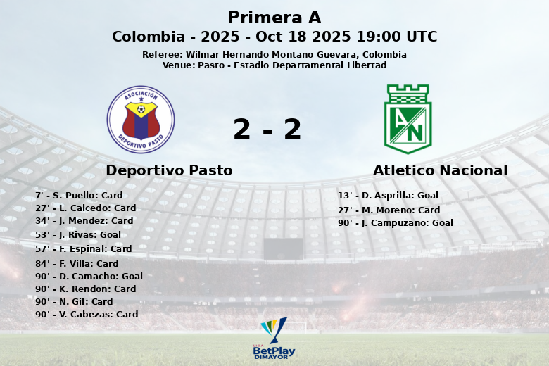 A partida começou com um ritmo frenético. O Atlético Nacional abriu o placar com um gol de D. Asprilla aos 13 minutos. O domínio do Pasto se materializou no segundo tempo, quando J. Rivas empatou aos 53 minutos. Quando parecia que a partida se encaminhava para o fim, D. Camacho marcou aos 90 minutos para dar a liderança ao time da casa. No entanto, nos últimos momentos da partida, J. Campuzano converteu um pênalti para o Atlético Nacional, selando o empate definitivo.