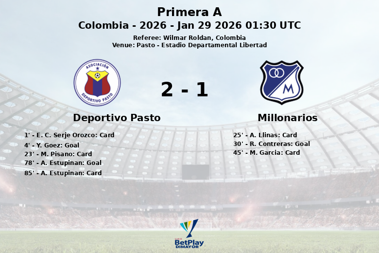 Pasto, Colômbia – Em uma partida disputada no Estádio Departamental Libertad, o Deportivo Pasto venceu o Millonarios com um placar final de 2 a 1 em um jogo marcado pela intensidade e cartões. A equipe da casa dominou a posse de bola com 69%, aproveitando para gerar 16 oportunidades de gol.