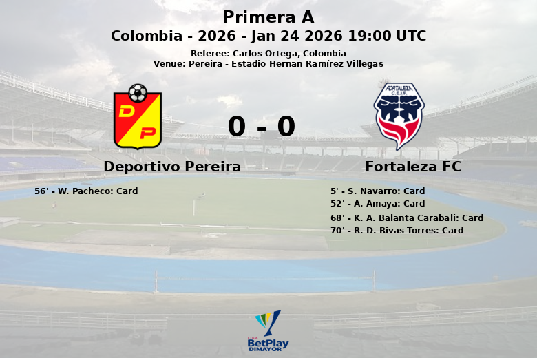 Pereira, Colômbia – Em partida válida pela segunda rodada da temporada regular da Primera A, Deportivo Pereira e Fortaleza FC empataram em 0 a 0 no Estádio Hernán Ramírez Villegas. O jogo, disputado sob o olhar atento do árbitro Carlos Ortega, foi caracterizado por um jogo físico e tático, refletido nos inúmeros cartões amarelos mostrados ao longo da partida.