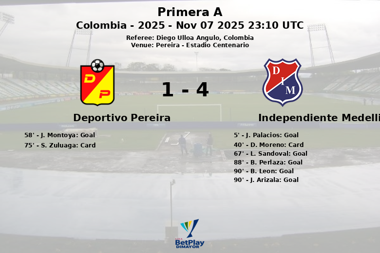 Pereira, Colômbia – Em uma partida carregada de emoções e alternativas, o Independiente Medellín venceu com autoridade o Deportivo Pereira no Estádio Centenario com um placar final de 5 a 1. O jogo, correspondente à 19ª rodada do Clausura da Primera A, foi marcado por duas expulsões e uma notável superioridade da equipe visitante na posse de bola (77%).