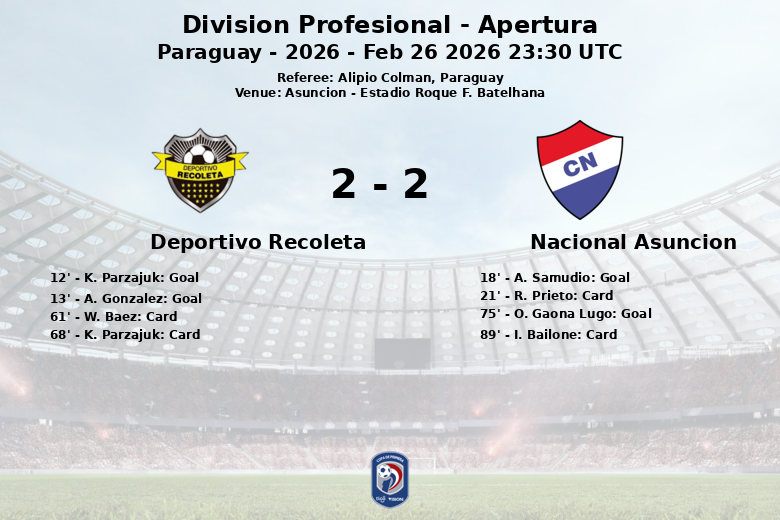 Assunção, Paraguai – Em um vibrante confronto disputado no Estádio Roque F. Batelhana, Deportivo Recoleta e Nacional Assunção empataram em um jogo cheio de alternativas. O Recoleta surpreendeu no início com dois gols rápidos de K. Parzajuk e A. Gonzalez aos 12 e 13 minutos, respectivamente. No entanto, o Nacional reagiu rapidamente, diminuindo a desvantagem aos 18 minutos com um gol de A. Samudio.