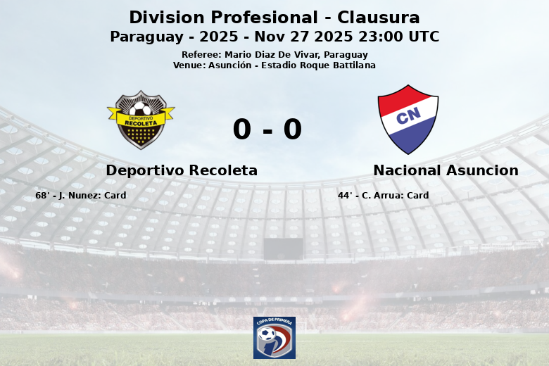 Assunção, Paraguai – Em uma partida correspondente à 22ª rodada do Clausura da Divisão Profissional, Deportivo Recoleta e Nacional Asunción empataram em 0 a 0 no Estádio Roque Battilana. O jogo, apitado pelo árbitro Mario Diaz De Vivar, foi caracterizado por sua intensidade e luta no meio-campo, embora tenha faltado clareza na definição.