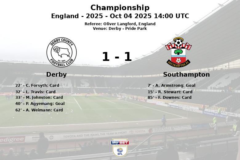 Em uma partida disputada em Pride Park, o Derby County e o Southampton FC empataram em 1 a 1 em seu confronto pelo Championship. O Southampton abriu o placar logo aos 7 minutos com um gol de A. Armstrong. O Derby respondeu com um gol de P. Agyemang aos 40 minutos, com assistência de A. Weimann.