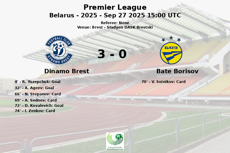 Brest, Bielorrússia – Em uma partida disputada no Stadyen DASK Brestski, o Dinamo Brest derrotou o BATE Borisov na 23ª rodada da Premier League bielorrussa. A partida, correspondente à temporada de 2025, foi marcada por gols logo no início e cartões amarelos.