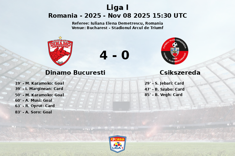 Bucareste, Romênia – Dinamo Bucuresti demonstrou sua superioridade em campo ao vencer contundentemente o Csikszereda no Stadionul Arcul de Triumf. A partida, correspondente à 16ª rodada da Liga I, temporada 2025, culminou com um claro domínio da equipe local.