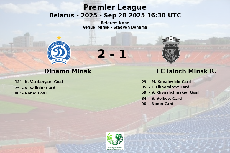 O Dinamo Minsk abriu o placar aos 13 minutos graças a um gol de K. Vardanyan, que aproveitou uma assistência para vencer o goleiro adversário. No entanto, o FC Isloch Minsk R. não se rendeu e, após algumas advertências a M. Kovalevich e I. Tikhomirov, conseguiu empatar aos 59 minutos por meio de V. Khvashchinskiy, com assistência de M. Kovalevich. O jogo foi intenso, com disputas constantes pela bola e vários cartões amarelos mostrados, incluindo um para V. Kalinin do Dinamo Minsk e outro para S. Volkov do FC Isloch Minsk R.