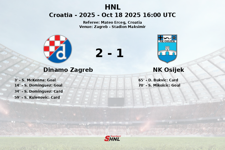 Zagreb, Croácia – O Dinamo Zagreb garantiu uma vitória em casa contra o NK Osijek em uma partida disputada no Stadion Maksimir. Desde o início, o Dinamo mostrou sua determinação, com S. McKenna abrindo o placar aos 3 minutos, assistido por I. Bennacer. Pouco depois, S. Dominguez ampliou a vantagem aos 14 minutos.