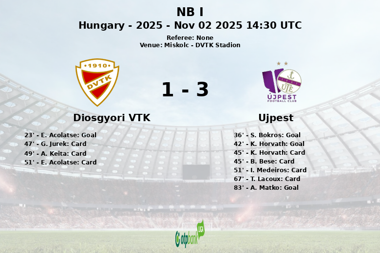 Miskolc, Hungria – Em uma partida disputada no DVTK Stadion, o Ujpest garantiu uma importante vitória fora de casa contra o Diosgyori VTK, em um jogo correspondente à 12ª rodada da temporada 2025 da NB I. A partida, que viu o Diosgyori VTK dominar a posse de bola com 60%, terminou com um placar que refletiu a eficácia do Ujpest em momentos chave.