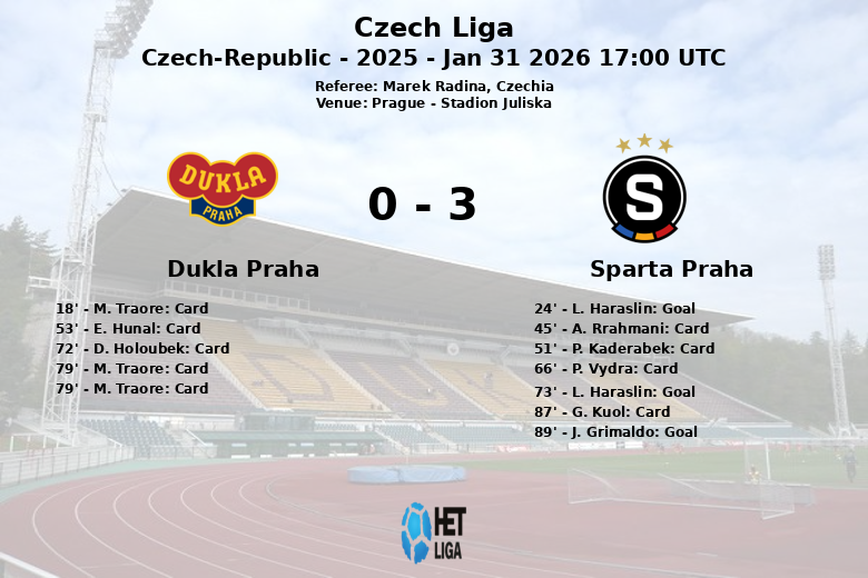 Praga, República Tcheca – O Sparta Praga venceu de forma convincente o Dukla Praga em uma partida da Liga Tcheca realizada no Stadion Juliska, com o placar final favorável ao Sparta. A partida, apitada por Marek Radina, foi marcada pela intensidade e um alto número de cartões.