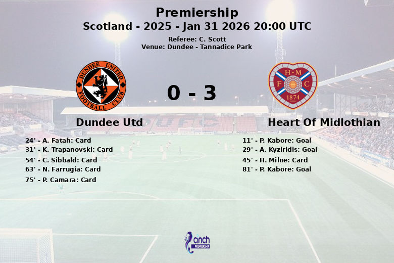 As estatísticas refletem a clara superioridade do Heart of Midlothian, com 20 chutes totais (11 no alvo) em comparação com os 3 do Dundee United (2 no alvo). Além disso, o Heart of Midlothian conquistou 6 escanteios em comparação com nenhum para a equipe da casa. O árbitro C. Scott distribuiu quatro cartões amarelos (um para o Heart of Midlothian e três para o Dundee United) e dois cartões vermelhos (ambos para o Dundee United). A partida, correspondente à 24ª rodada da Premiership escocesa, temporada de 2025, deixa o Heart of Midlothian com uma vitória convincente em um campo difícil.