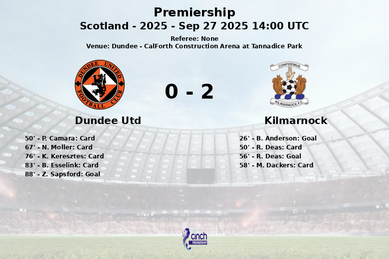 Dundee, Escócia – Em um confronto da Premiership realizado no CalForth Construction Arena no Tannadice Park, o Kilmarnock saiu vitorioso contra o Dundee Utd com um placar de 2 a 1. Apesar do Dundee Utd dominar a posse de bola com 59%, o Kilmarnock capitalizou efetivamente suas oportunidades de ataque.
