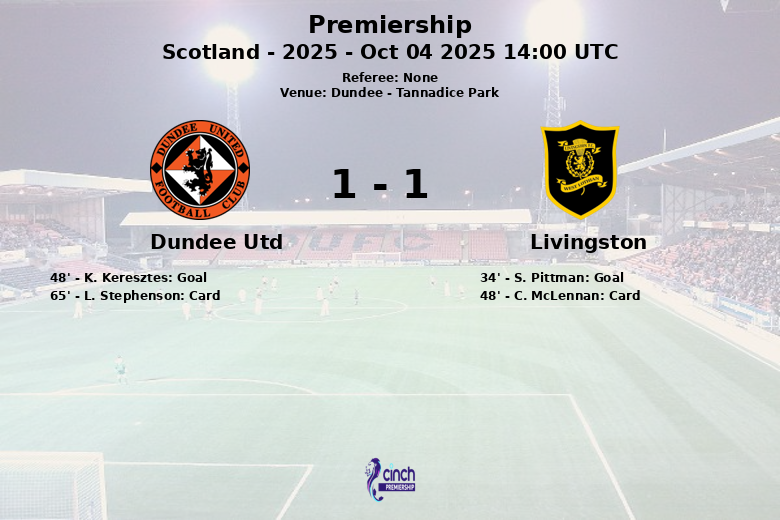 Dundee, Escócia – Em um jogo disputado no Tannadice Park, Dundee United e Livingston empataram em uma partida do Premiership escocês. A partida, válida pela 1ª Fase – 7ª rodada, viu o Livingston abrir o placar aos 34 minutos com um gol de S. Pittman, assistido por S. May. No entanto, o Dundee United respondeu logo no início do segundo tempo, aos 48 minutos, com um gol de K. Keresztes.