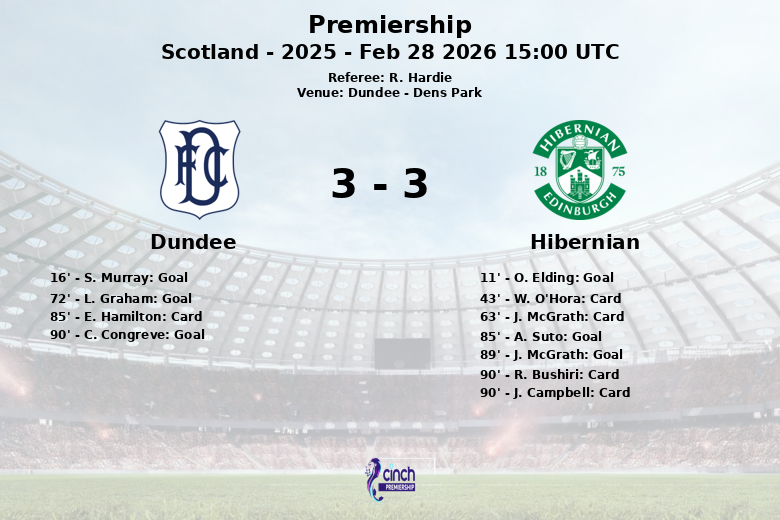 Dundee, Escócia – Um jogo vibrante e repleto de alternativas aconteceu hoje em Dens Park, onde Dundee e Hibernian empataram em uma partida válida pela Premiership escocesa. O Hibernian abriu o placar logo aos 11 minutos, com um gol de O. Elding após assistência de N. Cadden. No entanto, o Dundee respondeu rapidamente, igualando o marcador aos 16 minutos graças a S. Murray, assistido por L. Graham.
