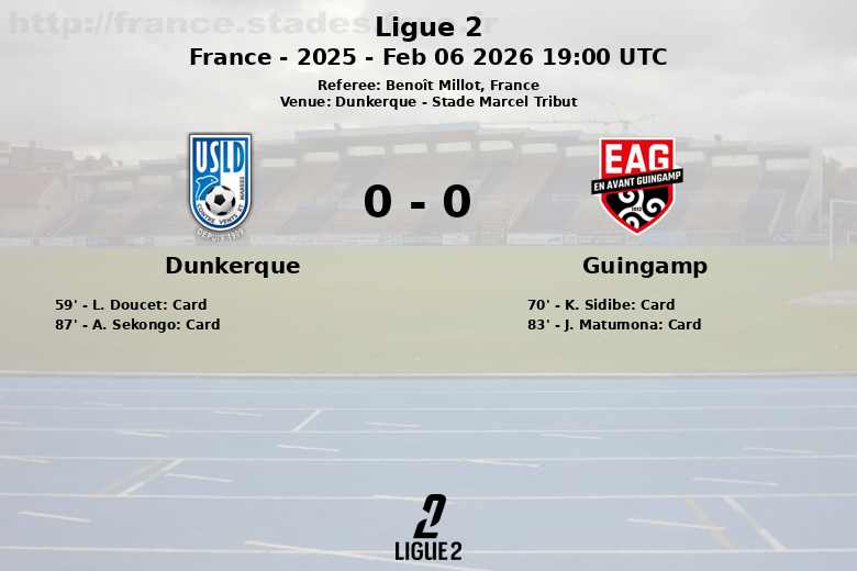 Dunkerque, França – Em um jogo disputado no Stade Marcel Tribut, Dunkerque e Guingamp empataram em 0 a 0 em uma partida marcada pela intensidade e disciplina. O jogo, correspondente à 22ª rodada da Ligue 2 da temporada de 2025, viu o Dunkerque dominar a posse de bola com 58%, embora não tenha conseguido traduzir isso em gols.