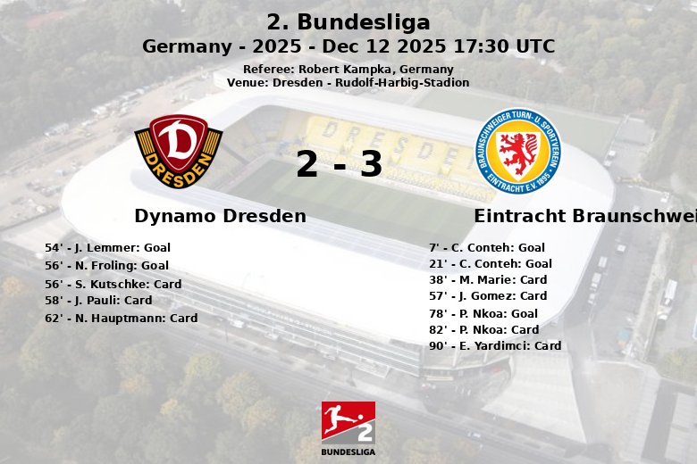 Dresden foi palco de um jogo vibrante da 2. Bundesliga entre o Dynamo Dresden e o Eintracht Braunschweig, que terminou em um empate que deixou ambas as equipes com sensações mistas. O Eintracht Braunschweig começou o jogo forte, abrindo o placar com dois gols rápidos de C. Conteh aos 7 e 21 minutos, dando-lhes uma vantagem confortável. No entanto, o Dynamo Dresden não desistiu e conseguiu empatar o placar em um intervalo impressionante de dois minutos, com gols de J. Lemmer aos 54 minutos e N. Froling aos 56. A partida ficou cada vez mais intensa, com vários cartões amarelos mostrados para ambos os lados. Quando parecia que o Dynamo Dresden conquistaria a vitória, P. Nkoa marcou para o Eintracht Braunschweig aos 78 minutos, empatando o placar e silenciando a torcida local. Embora o Eintracht Braunschweig tenha tido um número maior de chutes (17 contra 9 do Dynamo Dresden), a posse de bola foi igual com 50% para cada equipe. O árbitro Robert Kampka teve uma tarde movimentada, mostrando um total de sete cartões amarelos durante a partida.