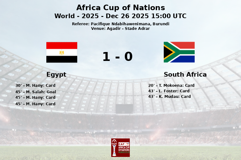 Agadir, Marrocos – Em um jogo repleto de emoção e cartões, o Egito garantiu uma importante vitória sobre a África do Sul no Stade Adrar, na fase de grupos da Copa das Nações Africanas de 2025. O único gol da partida veio pouco antes do intervalo, quando Mohamed Salah converteu um pênalti.