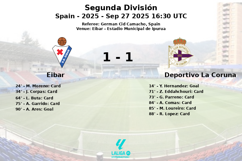 Eibar e Deportivo La Coruña empataram em um jogo disputado no Estádio Municipal de Ipurua, válido pela sétima rodada da Segunda División. A partida, arbitrada por Germán Cid Camacho, foi marcada pela intensidade e pelos inúmeros cartões amarelos.