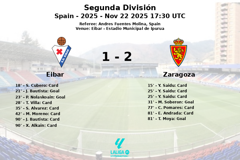 Apesar de jogar com dez homens, o Zaragoza conseguiu empatar aos 31 minutos através de um penálti convertido por M. Soberon. Na segunda parte, o Eibar continuou a pressionar e a criar oportunidades, mas a defesa do Zaragoza, liderada pelo seu guarda-redes, manteve-se firme. T. Moya surpreendeu o Eibar aos 81 minutos com um golo que resultou no empate final. A partida terminou com um resultado de 2 a 2, deixando um sabor agridoce para o Eibar, que merecia mais, e um ponto valioso para o Zaragoza na sua luta para subir posições na tabela. O árbitro Andres Fuentes Molina teve uma tarde agitada, mostrando um total de 10 cartões amarelos (6 para o Eibar e 4 para o Zaragoza) além do cartão vermelho a Saidu.