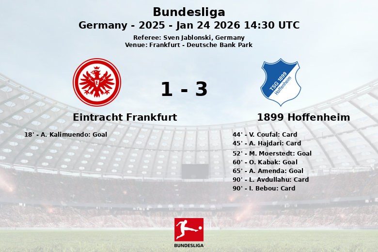 A partida foi marcada pela intensidade e luta no meio-campo. O Hoffenheim acumulou três cartões amarelos (V. Coufal, A. Hajdari e L. Avdullahu) enquanto o Eintracht Frankfurt conseguiu manter a disciplina sem advertências. Quanto à posse de bola, o Hoffenheim dominou ligeiramente com 53% contra 47% do Eintracht. Ambas as equipes mostraram uma vocação ofensiva semelhante, com o Hoffenheim realizando 10 chutes (5 no gol) e o Eintracht 9 (3 no gol). No final, um empate vibrante que deixa ambas as equipes com a necessidade de continuar somando pontos na Bundesliga. I. Bebou também recebeu um cartão amarelo.