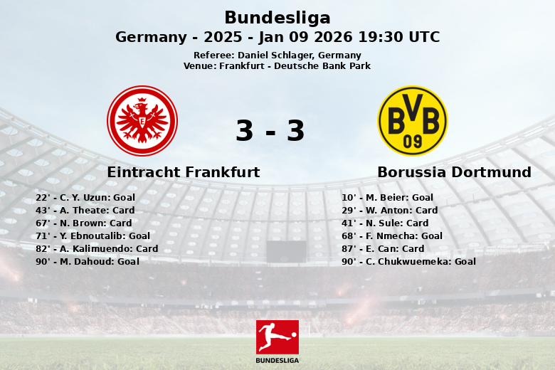 O Borussia Dortmund golpeou primeiro aos 10 minutos, com um gol de M. Beier, passe de J. Ryerson. No entanto, o Eintracht respondeu com um pênalti convertido por C. Y. Uzun aos 22 minutos. A partida se tornou disputada no meio-campo, com vários cartões amarelos mostrando a intensidade do jogo.