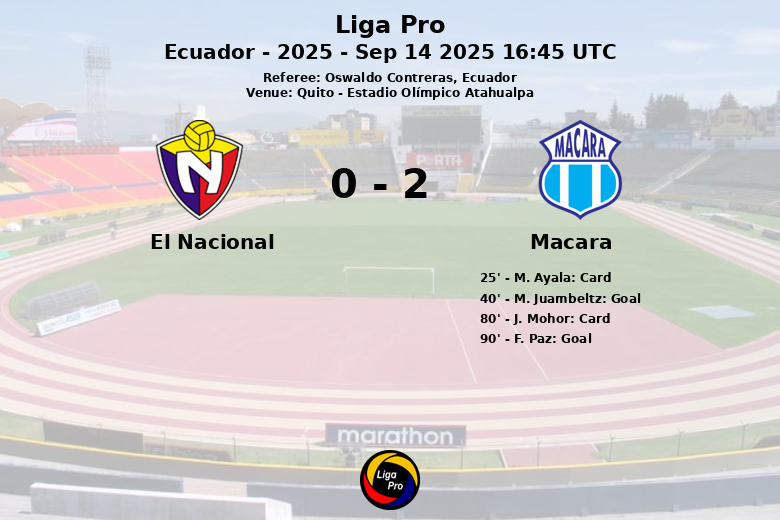Quito – Em um jogo disputado no Estádio Olímpico Atahualpa, Macará venceu o El Nacional por 2 a 0, em partida válida pela 28ª rodada da Liga Pro. A equipe de Ambato, embora tenha tido menos posse de bola (44% contra 56% do El Nacional), mostrou-se mais eficaz em frente ao gol.
