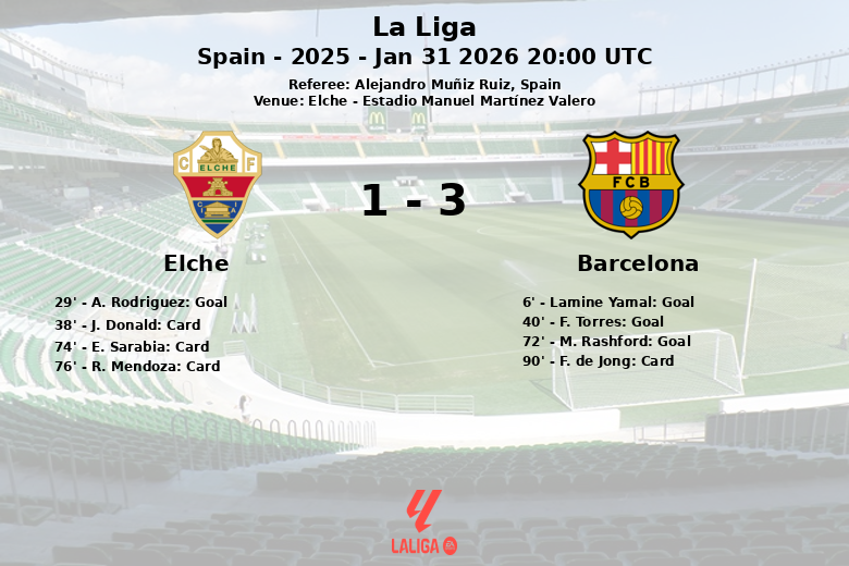 Lamine Yamal abriu o placar para o Barcelona aos 6 minutos, com um belo gol após assistência de D. Olmo. No entanto, o Elche respondeu com um gol de A. Rodriguez aos 29 minutos, empatando o jogo graças a um passe de G. Valera. Antes do intervalo, Ferran Torres devolveu a vantagem ao Barcelona aos 40 minutos, assistido por F. de Jong.