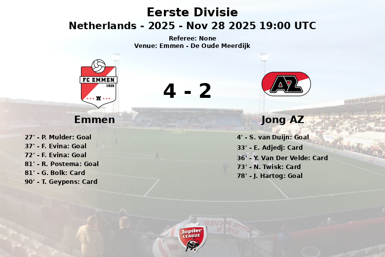 O Emmen aproveitou a sua vantagem numérica e F. Evina marcou aos 37 minutos, assistido por D. Nunumete, aumentando a vantagem da sua equipa. A segunda parte continuou com o domínio do Emmen, com um segundo golo de F. Evina aos 72 minutos, assistido por R. Postema. O Jong AZ tentou reagir e J. Hartog marcou aos 78 minutos, assistido por K. Boogaard. No entanto, a resposta do Emmen foi imediata, com um golo de R. Postema aos 81 minutos, assistido por F. Gerezgiher, estendendo a sua vantagem.