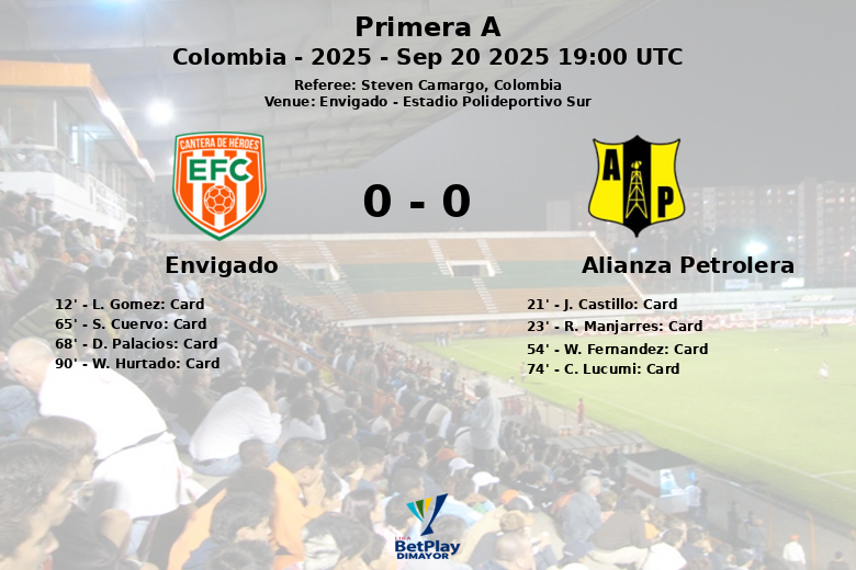 Envigado e Alianza Petrolera empataram em 0-0 em uma partida disputada no Estádio Polideportivo Sur, correspondente à 12ª rodada do Clausura da Primeira A colombiana. O encontro, arbitrado por Steven Camargo, foi caracterizado por um alto número de faltas e cartões amarelos, refletindo a intensidade e o atrito no meio-campo.