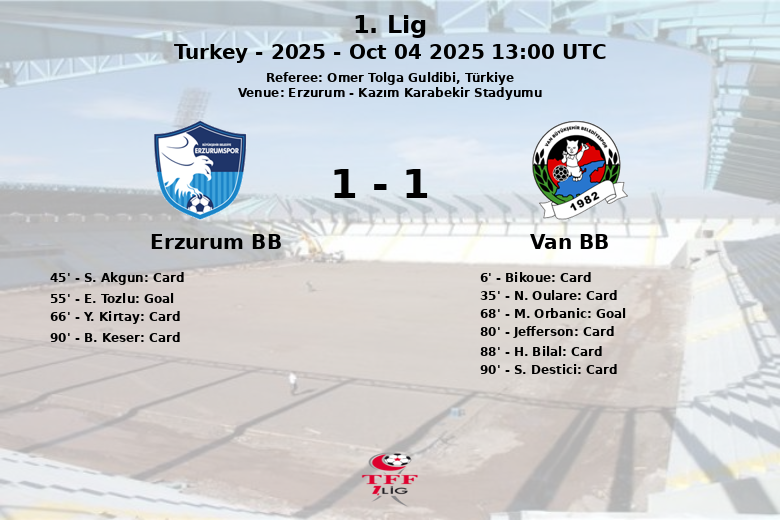 Erzurum, Turquia – Em um confronto tenso e marcado por infrações, o Erzurum BB conseguiu superar o Van BB com um placar de 1 a 1 no Kazım Karabekir Stadyumu. A partida, correspondente à nona rodada da 1. Lig, foi caracterizada por um jogo físico e um alto número de cartões amarelos.
